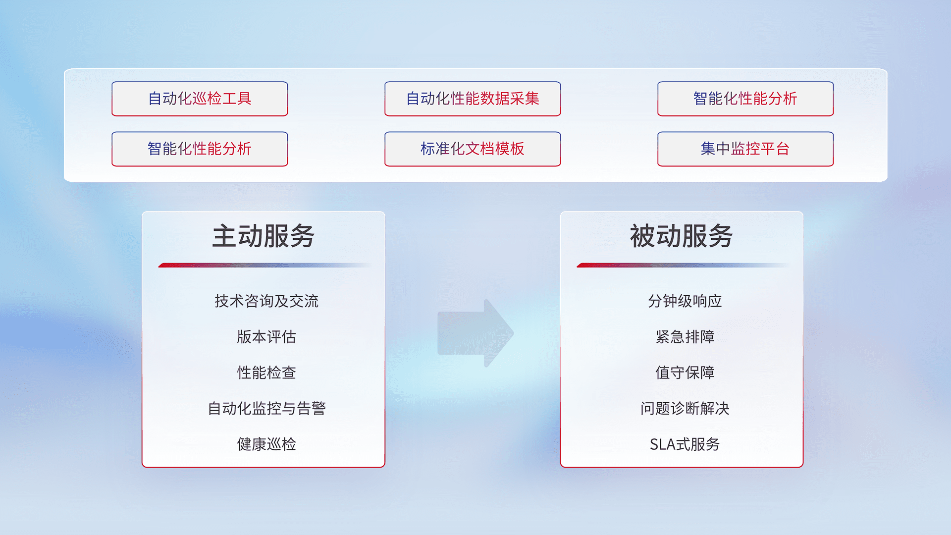 智能化工具和标准化文档,,保障服务质量,,,提供主动服务(包含技术咨询、、、、版本评估、、、、性能检查、、自动化监控与告警、、健康巡检)和被动服务包含(分钟级响应、、紧急排障、、值守保障、、、、问题诊断解决、、、、SLA服务)。。